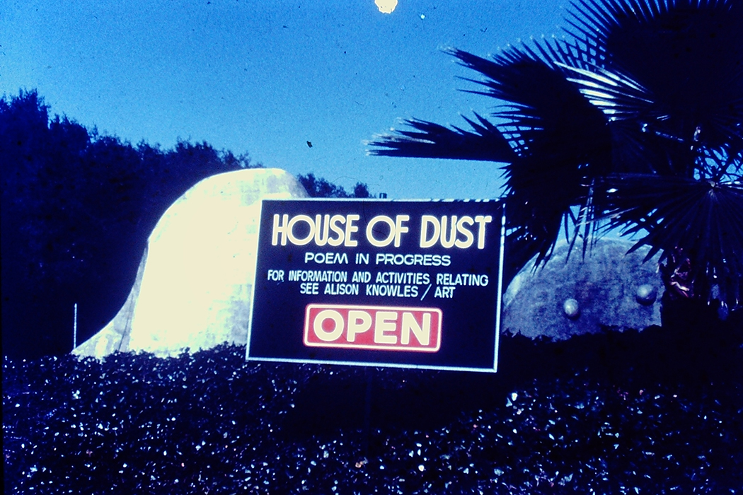 The House of Dust de Knowles est l’un des tout premiers poèmes informatisés. Il se compose de la phrase « une maison de » suivie d’une séquence aléatoire comprenant : 1) un matériau, 2) un site ou une situation, une source de lumière, et 3) une catégorie d’habitants, chacun choisi à partir de quatre listes distinctes. En 1968, ce poème a été traduit en une structure physique installée à Chelsea, New York puis à CalArts, à Burbank en Californie, où Alison Knowles fut invitée à enseigner entre 1970 et 1972. Sa structure ouverte en mutation permanente accueillait des artistes et étudiants qui produisaient œuvres, concerts, lectures, films et performances.